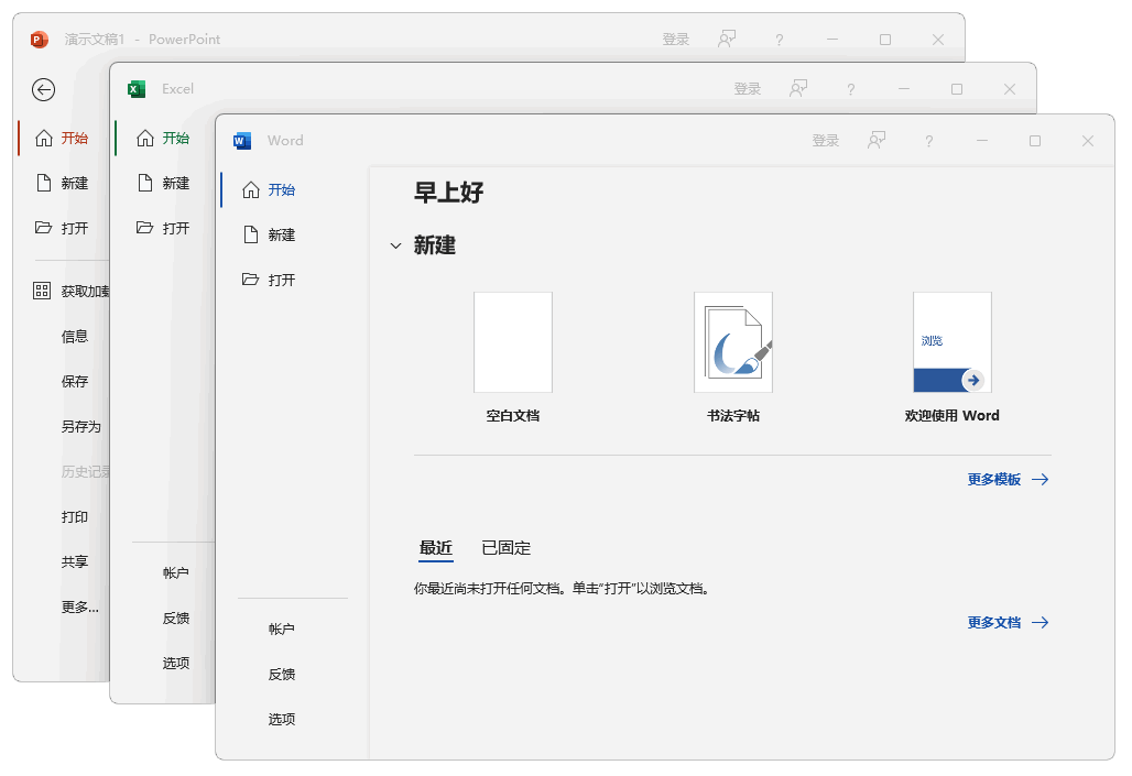 默认安装 Word、Excel、PowerPoint 三大组件,其他组件可选安装,