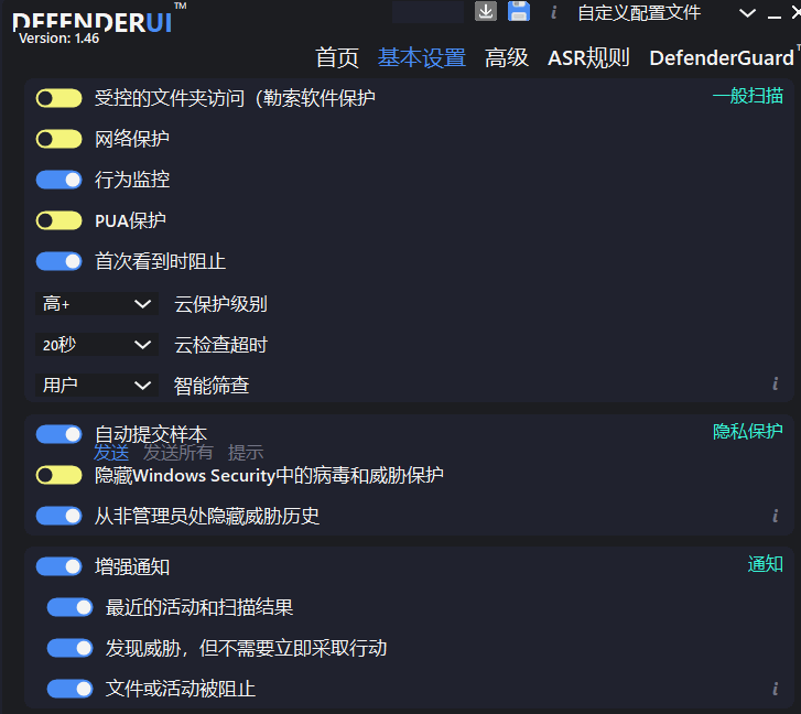 DefenderUI 提供了:默认模式/高级设置/ASR规则/DefenderGuard 4 种模式,对应 4 种不同的配置,用户可