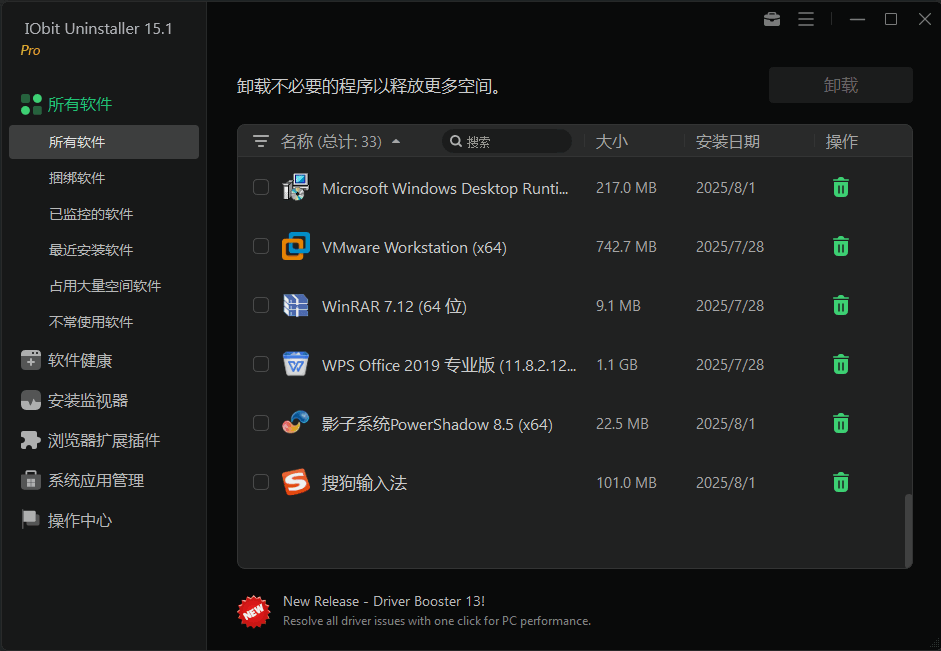 IObit Uninstaller是一款专业的软件卸载工具,功能包括:强制卸载,批量卸载,软件安装监视器,软件健康检查,