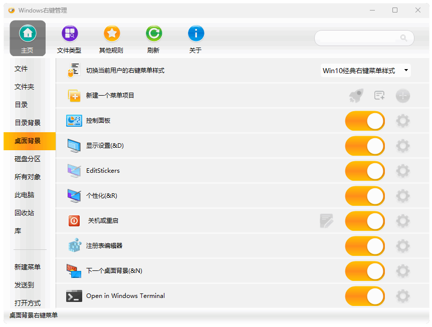 ContextMenuManager 支持对 Windows 各处右键菜单的管理,包括文件/文件夹、目录/目录背景、桌面背景、
